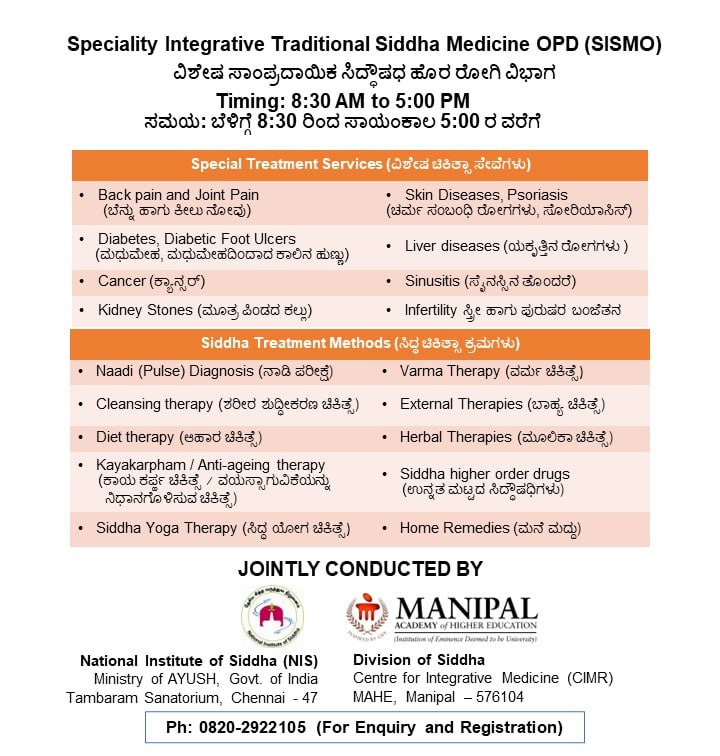 Center for Integrative Medicine and Research (CIMR) has been established in MAHE in 2015 with divisions for Ayurveda, Siddha, Yoga and Homeopathy. This OPD will be giving special treatment for joint pain, back pain, diabetes, and its complications like diabetic foot ulcers, cancers, kidney stones, chronic skin diseases like psoriasis, liver diseases, sinusitis, and infertility. Siddha methods such as naadi (pulse) examination, cleansing therapy, diet therapy, Siddha yoga therapy, Kaayakalpam (anti-ageing therapy), varma therapy, external therapies, herbal therapies, home remedies and Siddha higher order drugs will be given at nominal cost. Speciality Siddha doctors are deputed from NIS, Chennai to this OPD..